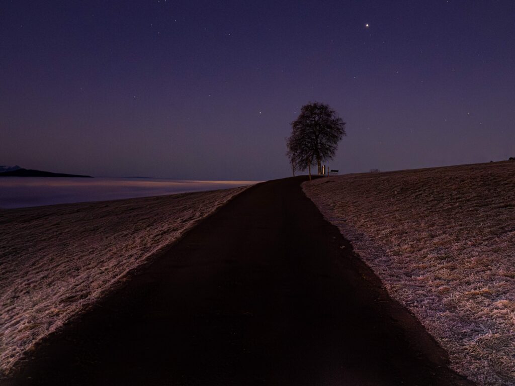 Als ich ankam, lag das Tal unter einer geschlossenen Nebeldecke. Über mir spannte sich ein klarer Himmel mit Sternen – eine besondere Stimmung, die man nur selten erlebt. Bevor die Sonne aufging, nutzte ich die Gelegenheit, um die Sterne über dem Nebelmeer festzuhalten. Diese ruhigen Minuten vor der Morgendämmerung haben immer etwas Magisches.