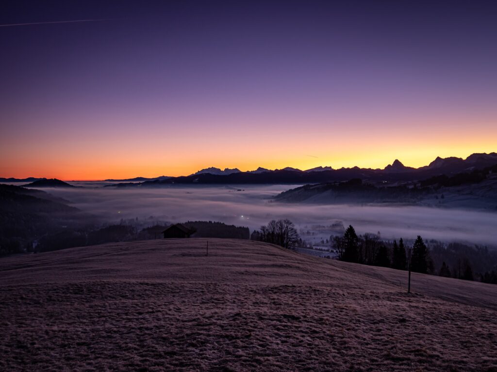 Wenn im Flachland dichter Nebel liegt, lohnt es sich häufig, etwas höher hinaufzugehen. Genau das war auch mein Plan an diesem Morgen. Der Raten bot die perfekte Höhe, um über dem Nebelmeer zu stehen und gleichzeitig den Sonnenaufgang zu beobachten.