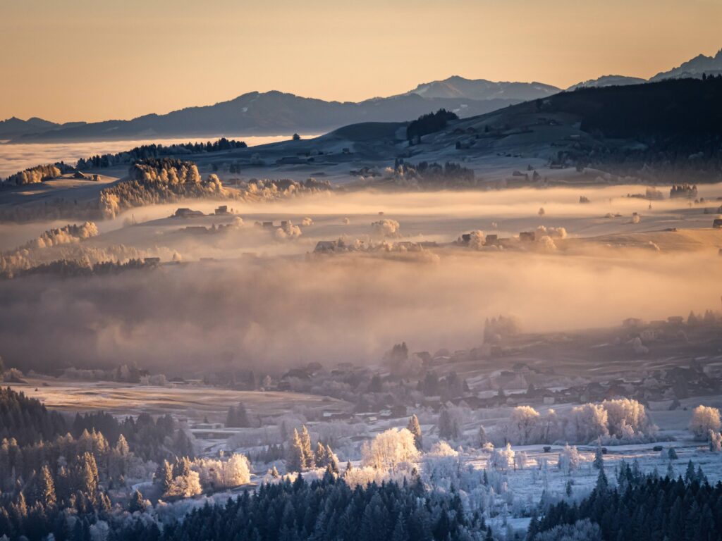 Der Nebel bewegte sich langsam durch die Wälder und um die Bäume herum. Immer wieder öffneten sich kleine Fenster im Nebel, durch die man einzelne Dörfer erkennen konnte. Genau solche Momente sind es, die eine Fototour besonders machen: kurze Augenblicke, in denen Licht, Nebel und Landschaft perfekt zusammenspielen.